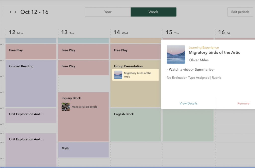 I’m now going to reimagine this timetable to make it conceptual. As a teaching team, we could identify conceptual understanding and dive into specific teacher and student questions every day. Using conceptual questions will help make learning truly transdisciplinary and will allow for in-depth inquiry, throughout the day! While planning on Toddle, teachers can map learning goals, key questions and learning experiences from their unit and single-subject planners to their weekly schedules. This allows teaching teams to keep conceptual questions in mind while planning their units and learning experiences.