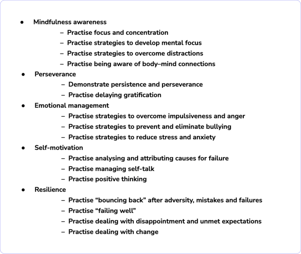 The impacts of state of mind are seen in all aspects of school life. This activity can be completed as part of an advisory or social-emotional discussion, or within specific classes. Students can think about how these areas can affect their learning and examine different strategies that work for them. It would be interesting to look at the impact of self-management skills at the end of an assessment to understand how focus, perseverance, resilience, etc. helped or hindered the student in achieving their best.