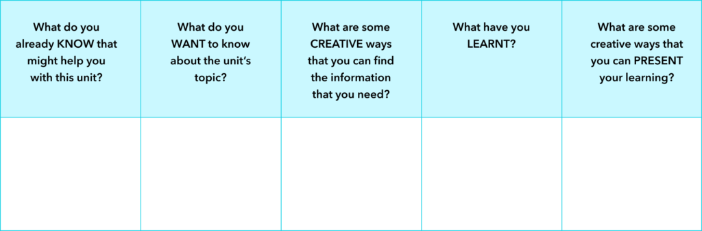 • During the unit: Get into groups and list out new learnings in column 4. Then think about creative ways you can present these new learnings and list them in column 5.