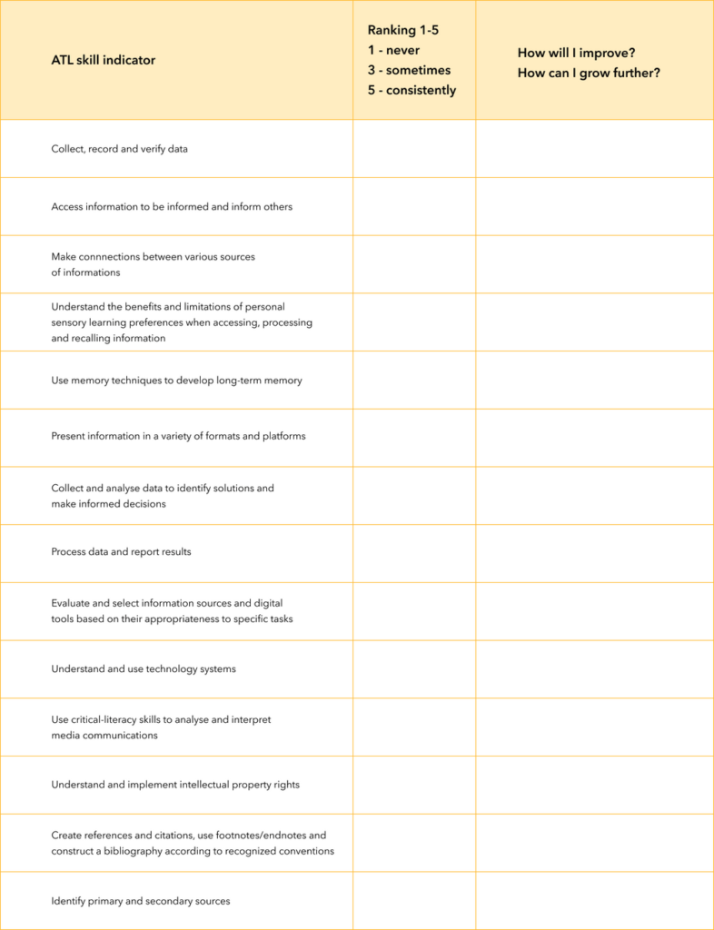 • Organise your notes afterward into the ATL categories – by colour or into a chart.