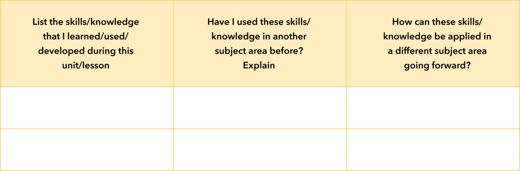 So much of what is learnt at school can be applied in different contexts, but students often struggle to apply their knowledge in different situations. To help the students identify opportunities for transfer you can have them identify other areas where they have already used this learning. They then brainstorm ideas of new applications of the same knowledge and skills.