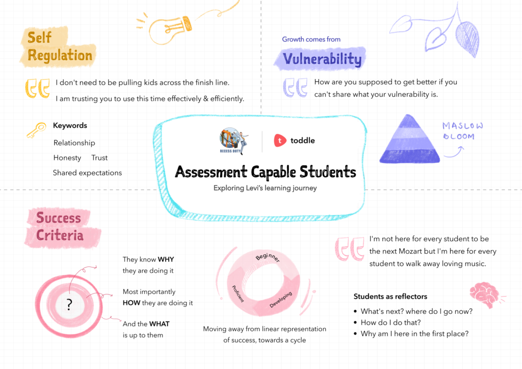 For the last two years, I have been working on developing assessment capability in my classroom. As a specialist teacher, I work with over 300 students and have spent this year trying to answer the guiding question, ‘How can I assess 300 students across multiple grades effectively while supporting agency?’. I had a chance to sit down with Cindy Blackburn on my podcast, Recess Duty, and reflect on my progress towards this goal.