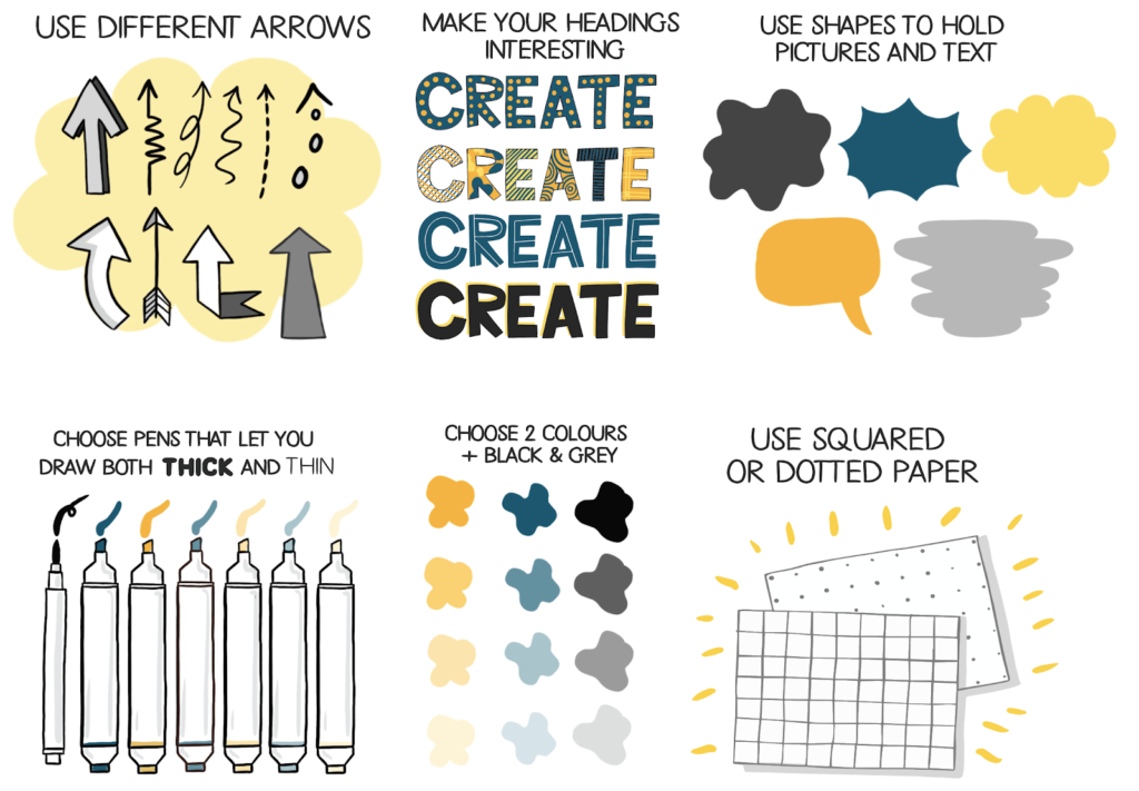 It doesn’t matter whether you are a good artist or not. In fact, I’ve noticed that children pay equal or even more attention when their teacher tries to draw and it comes out poorly. Children and adults don’t want to read massive amounts of information when it can be broken down into a few pictures. If you’re a P.E. teacher, practice drawing things that are relevant to what you do, like a football or a hockey stick. If you’re a Music teacher, learn how to draw the instruments you use in your lessons. Keep pictures as simple as possible and use fancy arrows and shapes to make your work more interesting. If you want to try sketchnoting I’ve drawn out a few shapes below to help you get started.