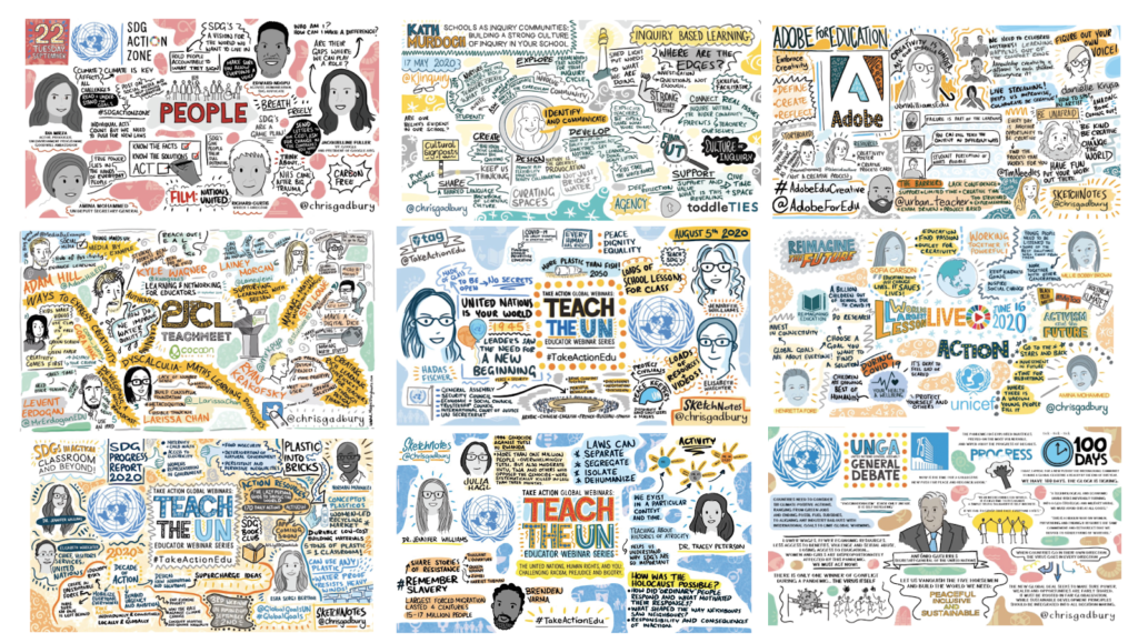 I used to get in all kinds of trouble at school for not being able to copy off the blackboard fast enough. In art college I stopped writing any notes and just learned to listen. It was many years later that I began taking notes by drawing pictures that somehow caught people’s attention. Since then, I started sharing this talent with teachers, students and anyone else who wanted to learn. I’ve even been commissioned to take notes for the United Nations.