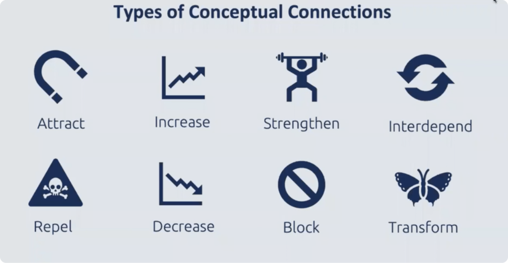 Connect: In the connect stage, we are looking to explore the relationships between the concepts. How do they interrelate in the real world and across contexts? Types of conceptual connections include to attract, increase, strengthen, inter-depend, repel, decrease, block, and transform amongst others.