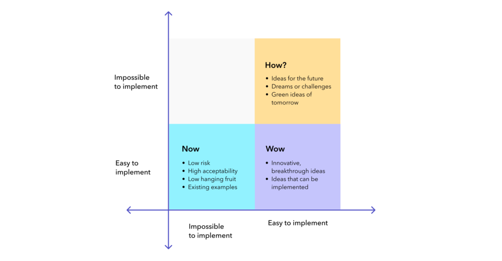This is a useful strategy to further push students’ thinking once the idea is finalized. This helps in evaluating existing ideas and ascertain if they are original and easy to implement. Students would need an X and Y matrix where X would represent originality and Y axis would represent implementation.
