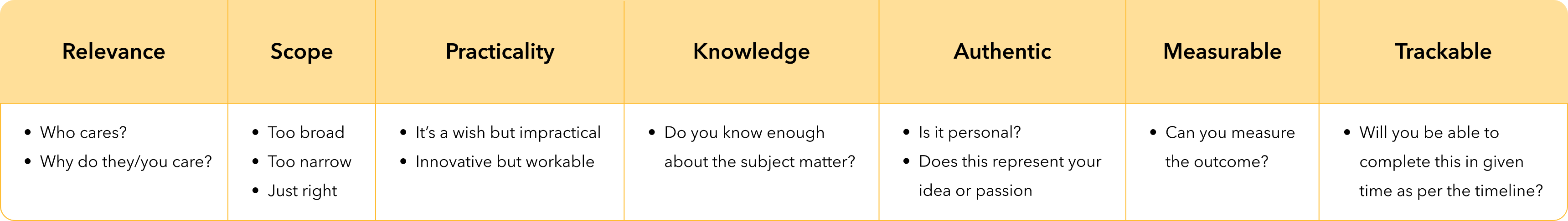 Each of these challenges can be resolved right at the ideation  stage in a student’s personal project journey if we are able to provide our students with the right guidance. But what does that mean for us as supervisors?