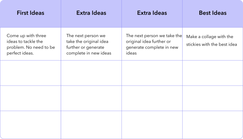 Using this idea generation technique, a student writes down three main ideas which they want to explore further. Thereafter, the page where ideas are documented is passed on to another student, who can continue to expand on those existing ideas or add their own. This strategy is very helpful to get various perspectives on the same idea and see deeper connections.