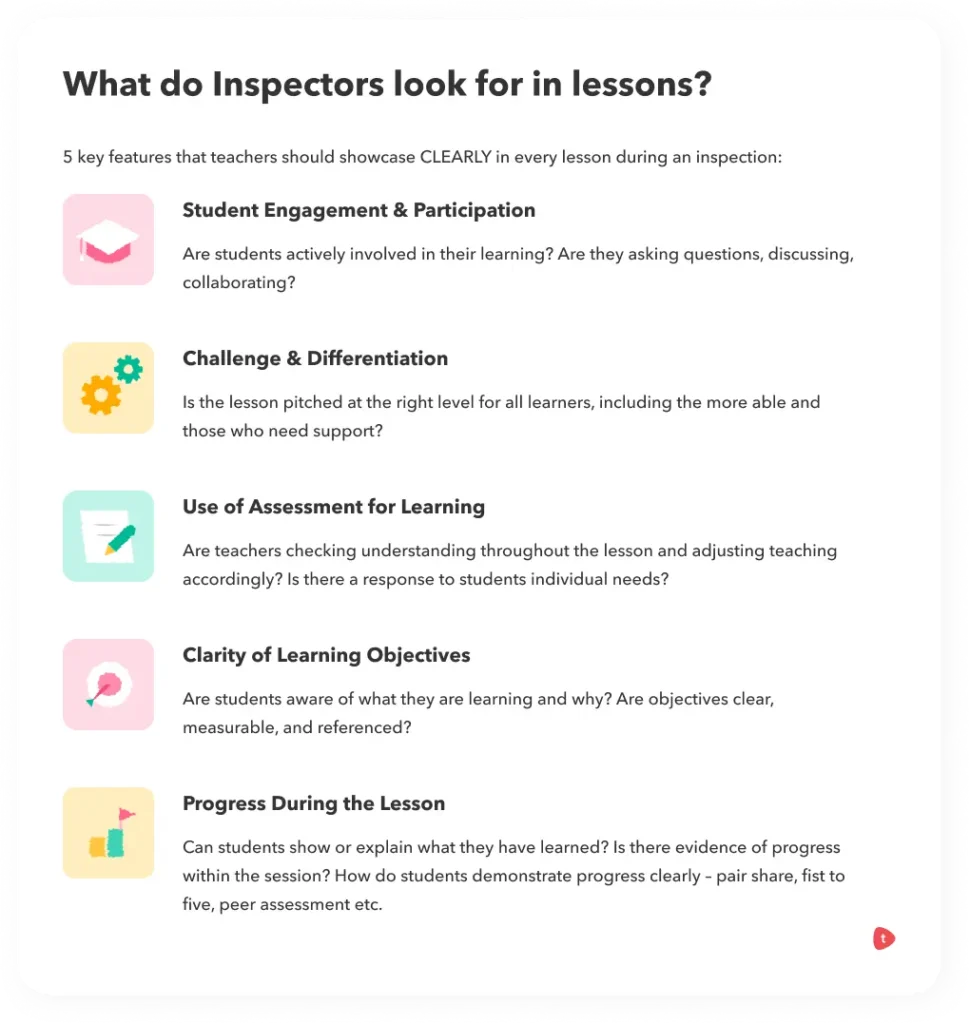 • Teaching & Learning QualityInspectors are not just looking at plans or policies, they want to see lessons in action – how teachers engage students, adapt to needs, and make progress visible.