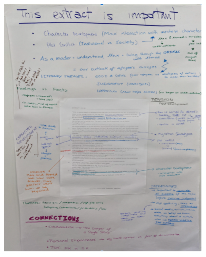 - After 20 minutes, groups move to another poster and respond to what is written there, add ideas, and ask questions. Here’s a sample of a marked-up poster with student notes: