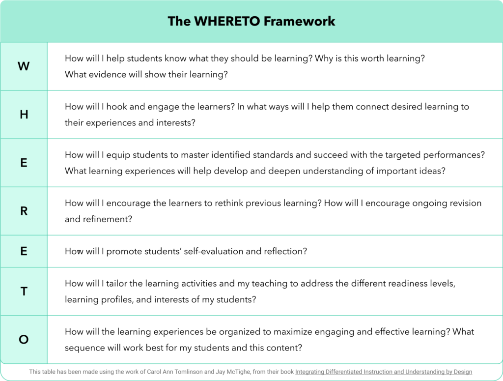 The acronym WHERETO is used by educators around the world while planning learning experiences in their units. It allows educators to plan keeping in mind student engagement.