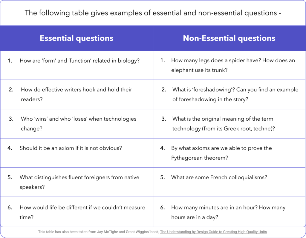 The following table is from Jay McTighe and Grant Wiggins’ book, The Understanding by Design Guide to Creating High-Quality Units, and highlights the differences between essential and non-essential questions –
