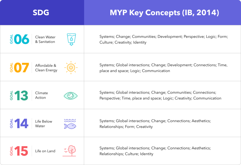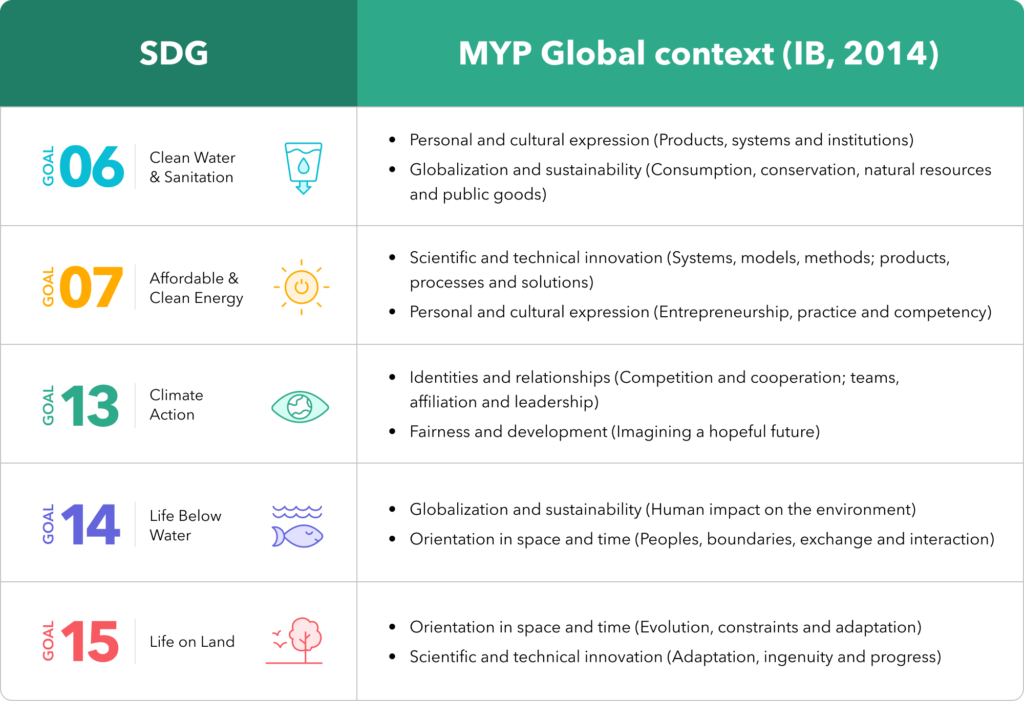 The MYP global contexts make great lenses for focusing inquiry into the SDGs. Each of the environmental SDGs (6, 7, 13, 14, 15) can align closely to one or more global contexts.