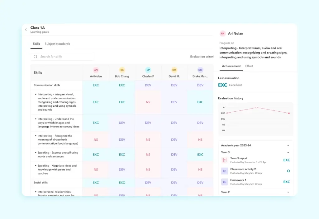 “On Toddle, various teachers could input grades for each skill across subjects. For instance, a student might be assigned an A for critical thinking in Math, while also receiving a B for the same skill in Science. All these grades are then visible on the student’s gradebook, offering our families a more comprehensive view of their children’s progress.
