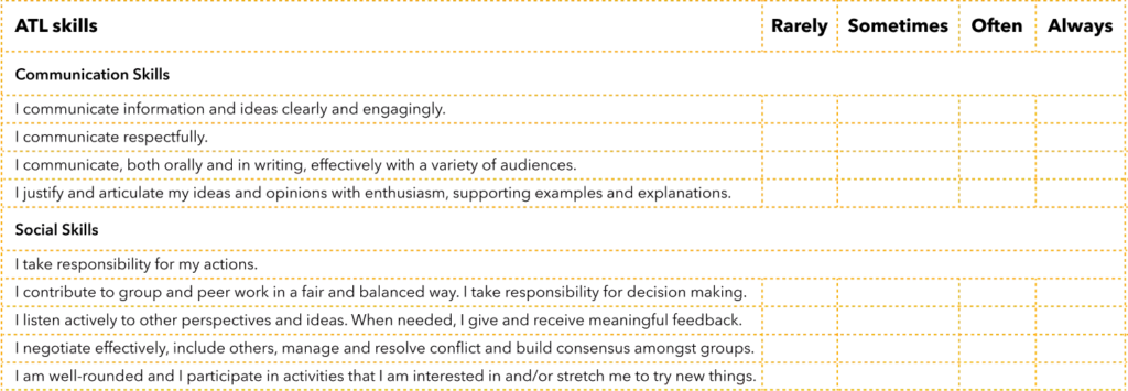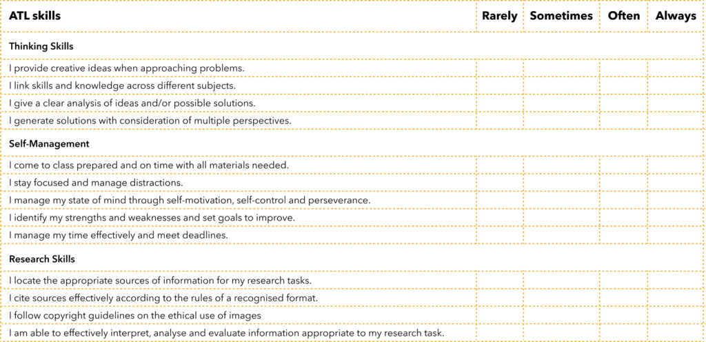 ATL skills play an important role in helping students learn about how they learn. Over time, students are able to develop clear and sophisticated understandings of how they learn best and how they can evaluate the effectiveness of their learning. This further helps students: