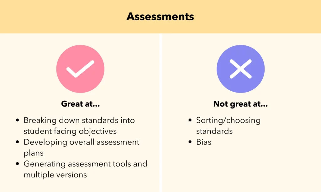 Remember, ChatGPT is not yet great at sorting through or selecting standards. It can be helpful to copy and paste the objectives or standards you plan to assess. Also, based on its training data ChatGPT is currently biased. It is important to read through test questions to scan for inherent bias and use your best judgement as a teacher.