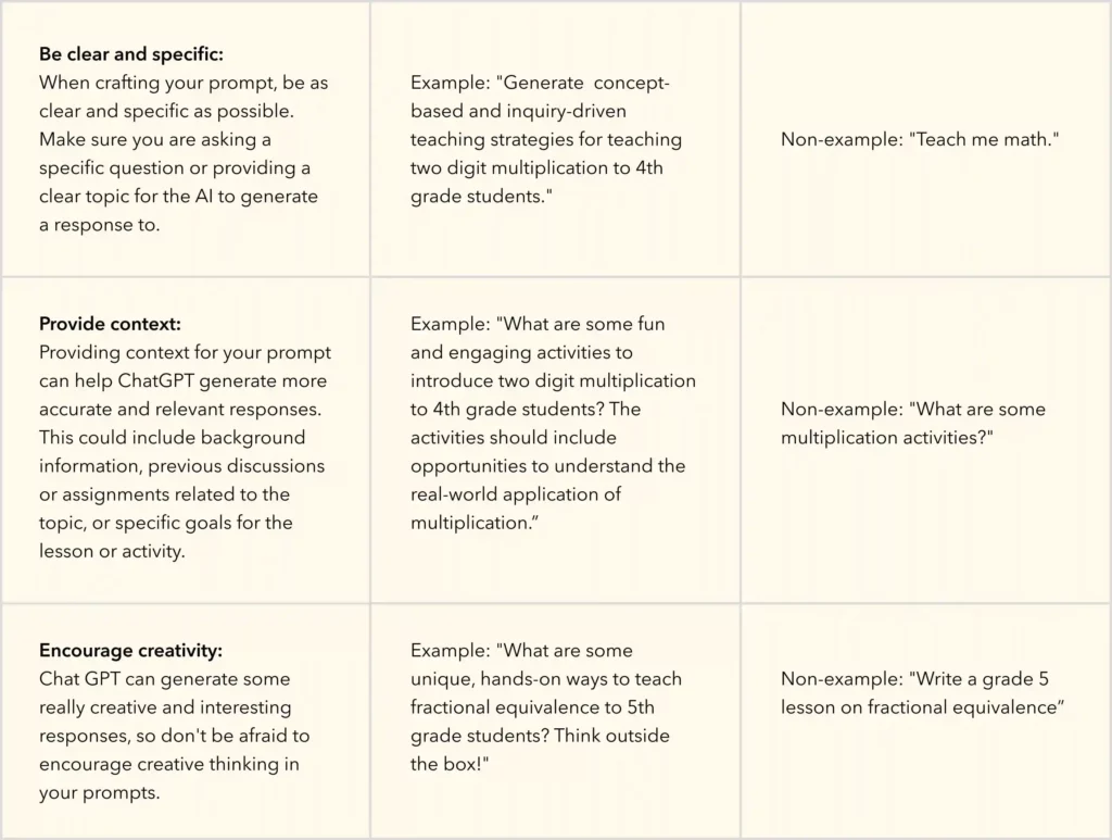 Generating prompts will arguably be one of the most important skills we can learn and teach our students. With ChatGPT, it’s all about being able to ask the right questions. A prompt is simply a question you are asking or a task that you want ChatGPT to complete. Remember, prompt generation is an iterative process, much like teaching and learning! If you don’t like your result the first time, try again! Here are tips to keep in mind while crafting prompts of your own: