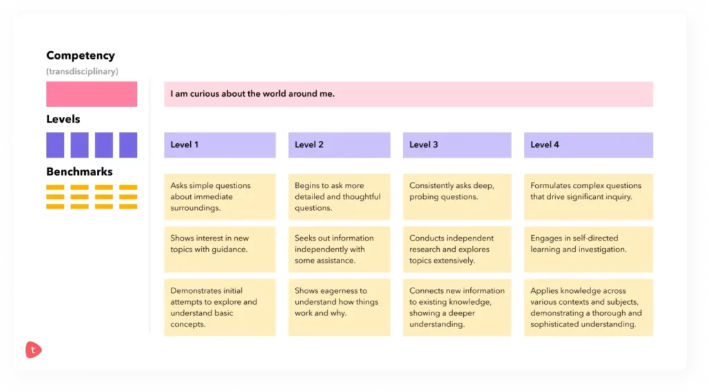 Here’s an example of a transdisciplinary competency organized by levels. A student demonstrates mastery when they consistently exhibit Level 4 behaviors independently and in new contexts.