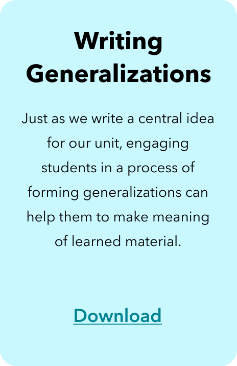 Knowledge: Identifying the new knowledge for a unit can often be challenging or feel counterintuitive to inquiry. However, this is a crucial step in planning! When we think about knowledge, we are determining the facts, information, case studies, or theories that will best support students in developing their understanding in a unit.