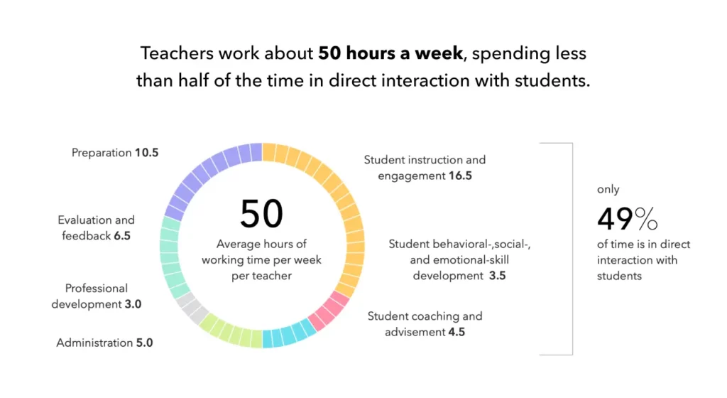 “As summarized in an article by the EdWeek Research Center, teachers spend only 25 hours in the classroom every week. Teaching, in itself, is not the source of excessive workloads and teacher burnout; it’s the secondary and tertiary responsibilities that put undue pressure on their schedules.”
