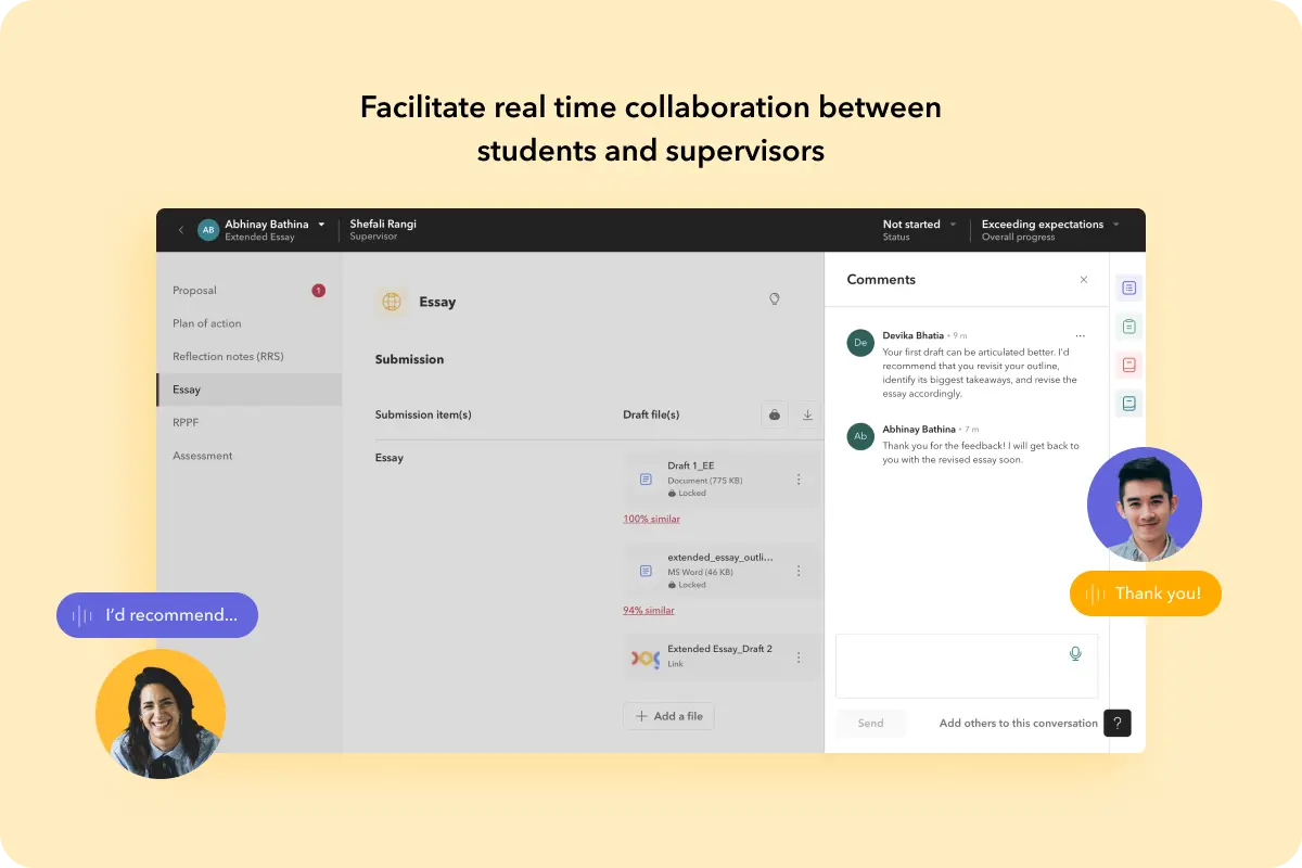 Your IBDP teachers wouldn’t need to wait until their first EE or CAS interviews to give feedback. With Toddle’s inbuilt chat interface, your teachers and students can exchange ideas in real time through every stage of the process. And not just as text, but also as audio/video messages! Got a brilliant idea for a student’s EE as you’re about to call it a day? Simply tap the mic icon and leave a voice note.