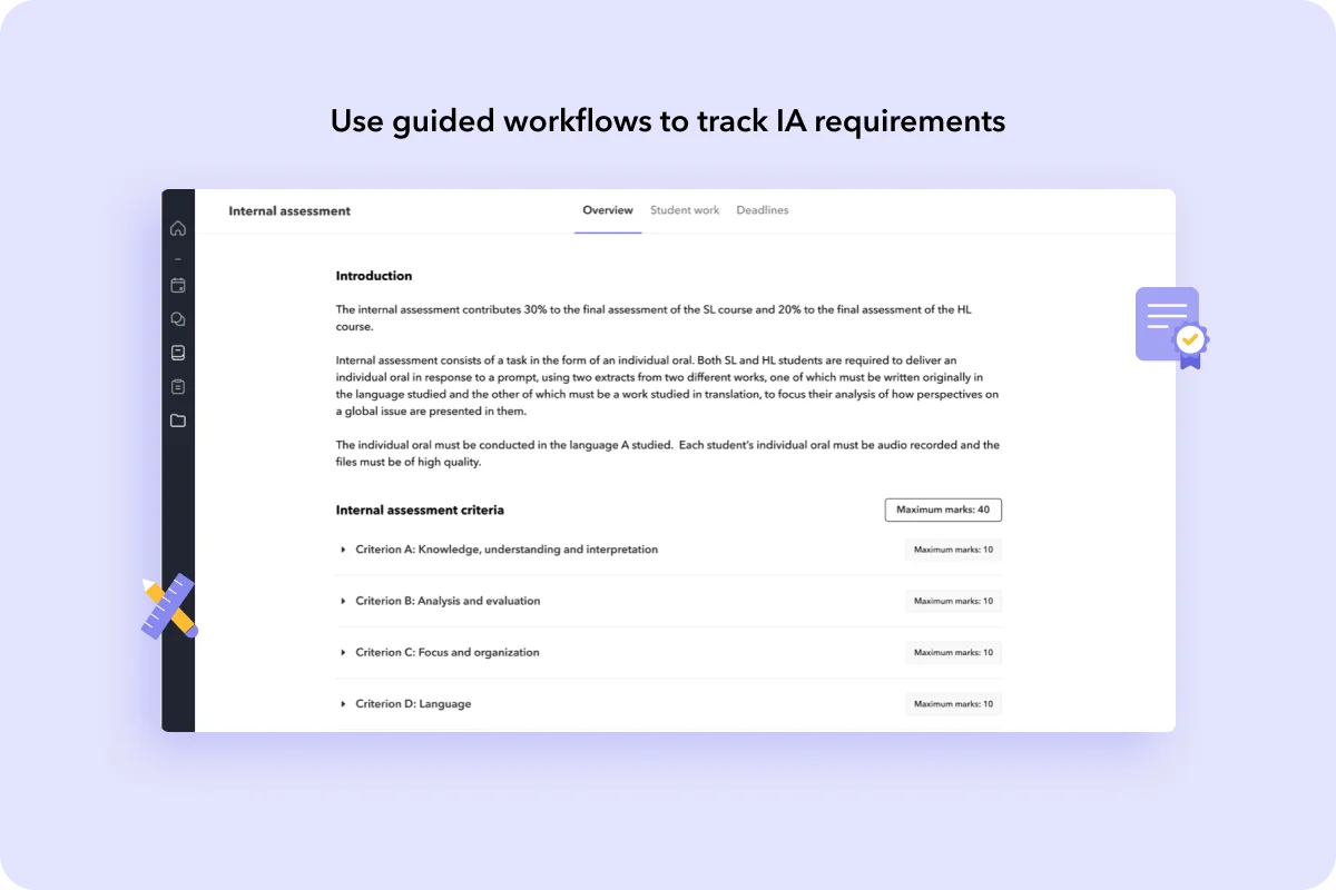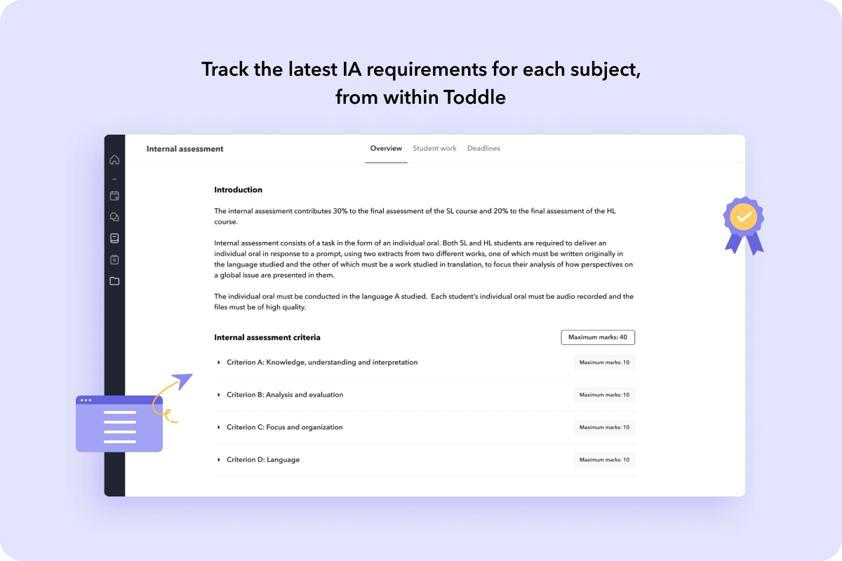 Keeping up with the ever-changing IA requirements can be challenging. At Toddle, we make sure to examine the IB guides periodically and automatically update the latest IA requirements in the guided workflows within the platform. With these workflows, you and your teachers will have access to the latest requirements for each subject, right within Toddle.