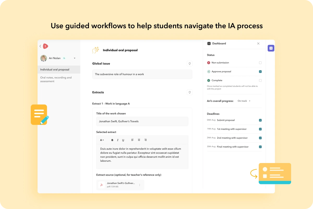 Toddle’s IA module helps you organise and track requirements, progress, and deadlines all on one beautiful interface – providing a hassle-free IA experience for your IBDP team: