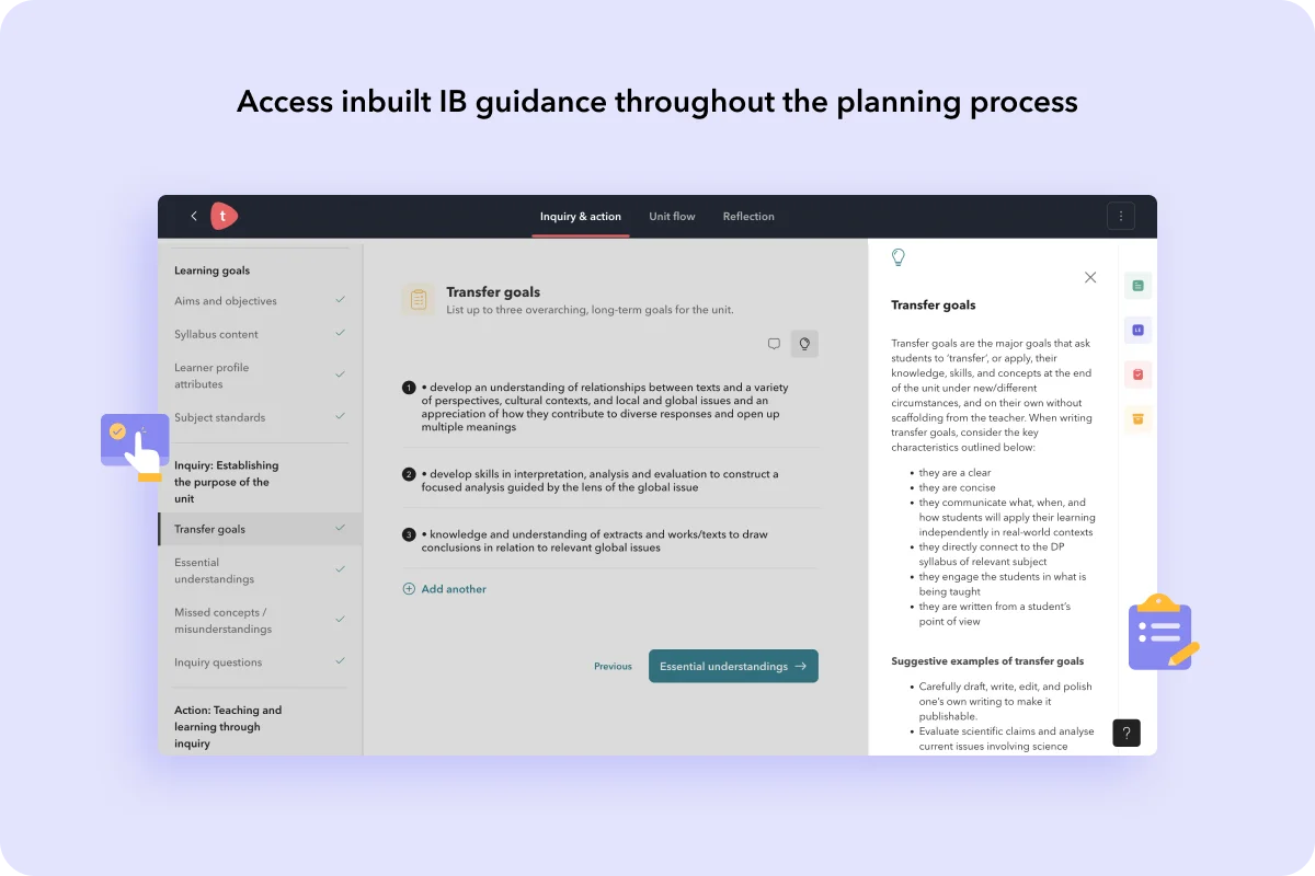 Relevant excerpts from IB guides will be available at each step of the planning process. Want to see some best practices for integrating ToK into your subjects? Need help with picking a differentiation approach for your unit? You’ll find all the necessary information and more, right within the planner! In addition to helping your new teachers navigate the planning process, this also helps ensure that the IB guidelines remain at the forefront of your school’s unit plans at all times.