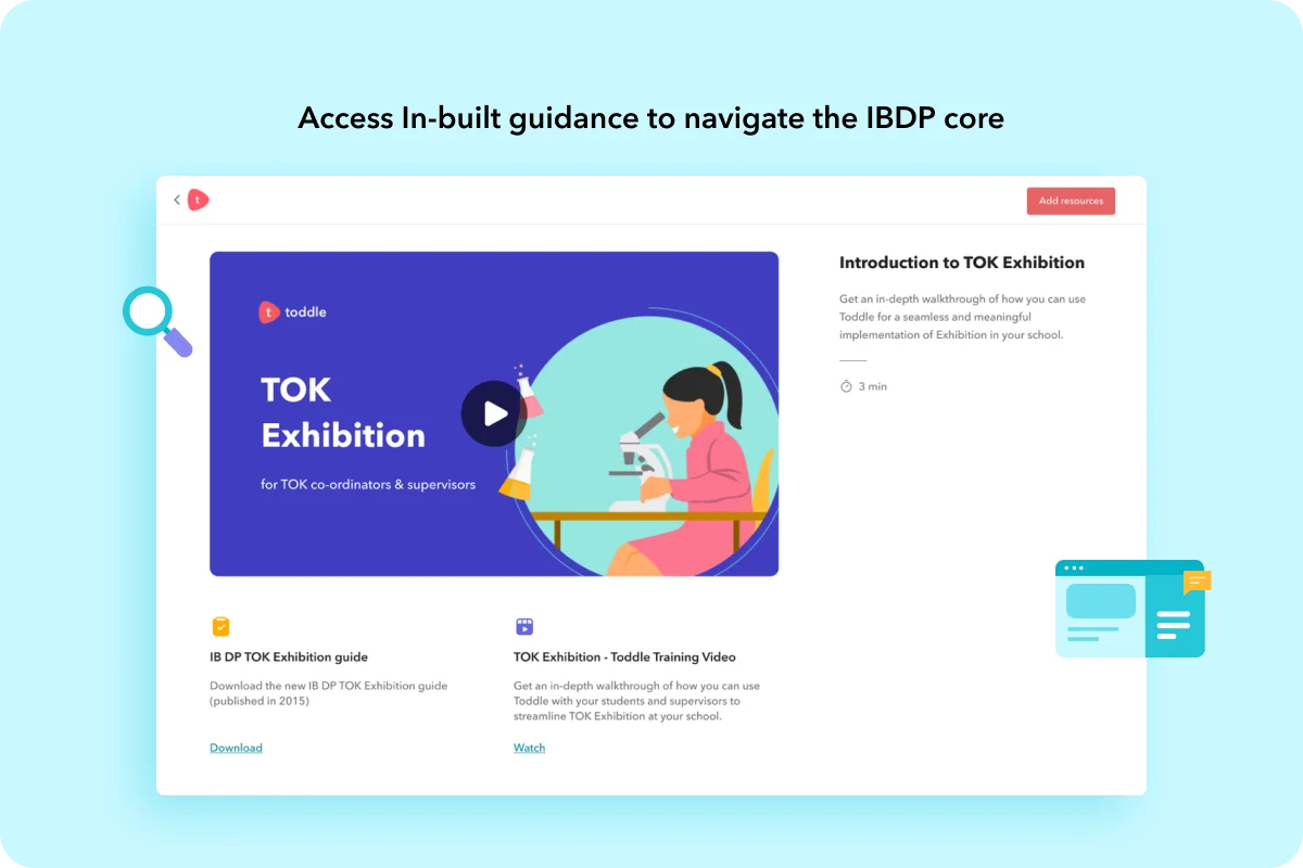 One common problem in IBDP schools is that students don’t always have enough time with their supervisors to learn the steps involved in EEs and CAS projects. With Toddle, you’ll find embedded resources for every step of the process. This saves your teachers significant time while empowering students to become more independent learners.