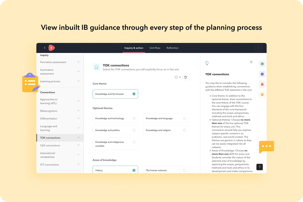 Your teachers can create and manage unit plans, lesson plans, assessments, and student activities all within Toddle. This not only improves visibility but also comes in incredibly handy when you need to collect evidence for your IB visit! - Access stepwise IB guidance throughout the planning process :