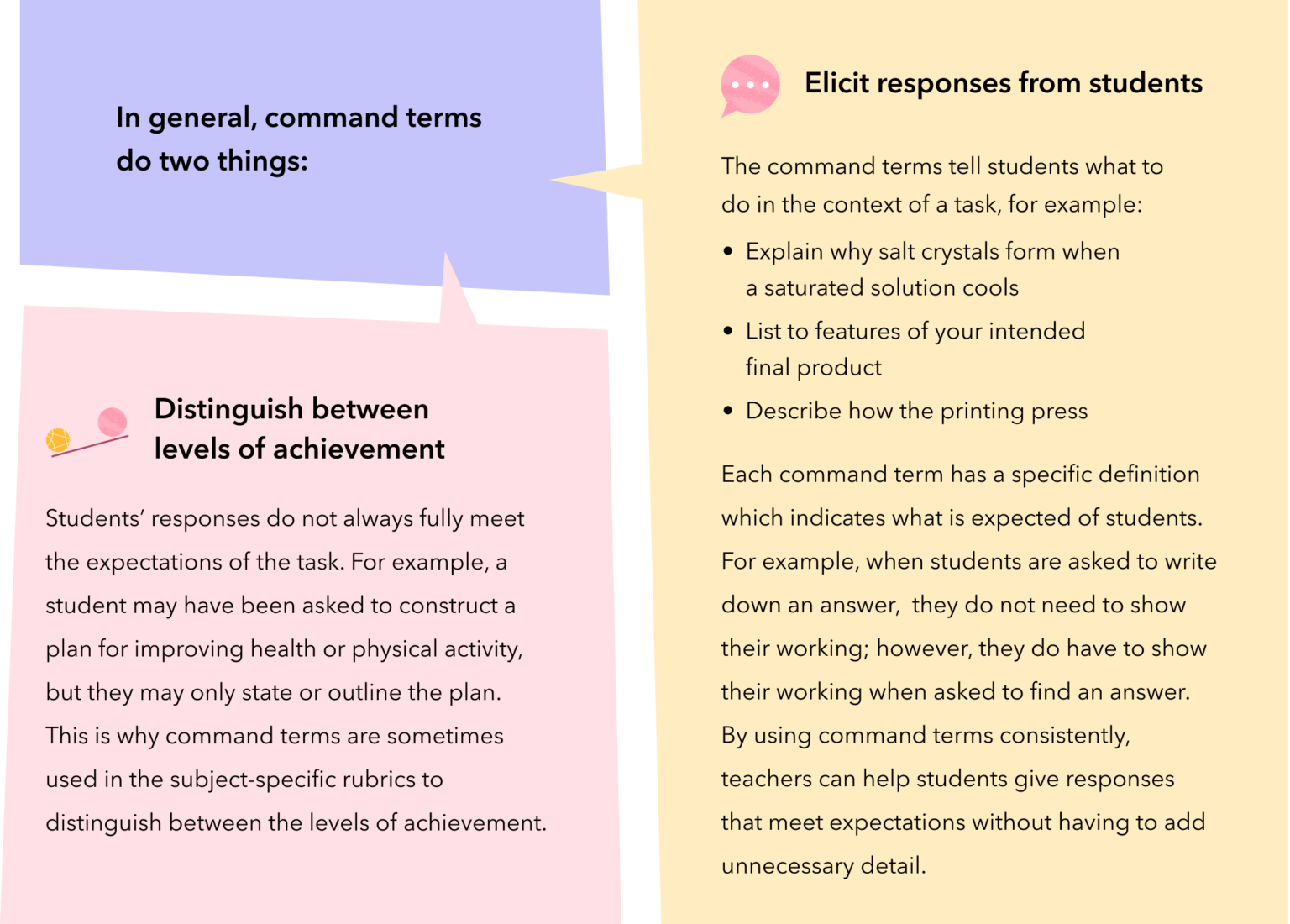 These usually appear in bold in MYP publications. The command terms have specific definitions that help to clarify exactly what is expected at each level of achievement.
