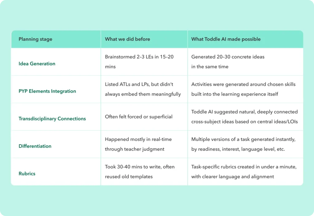 We had just finished our first full cycle with a new POI, and wanted to evaluate which learning experiences to carry forward. As our first experiment, I asked teachers to run their learning experiences through Toddle AI before we met. And the energy in the staffroom shifted completely.