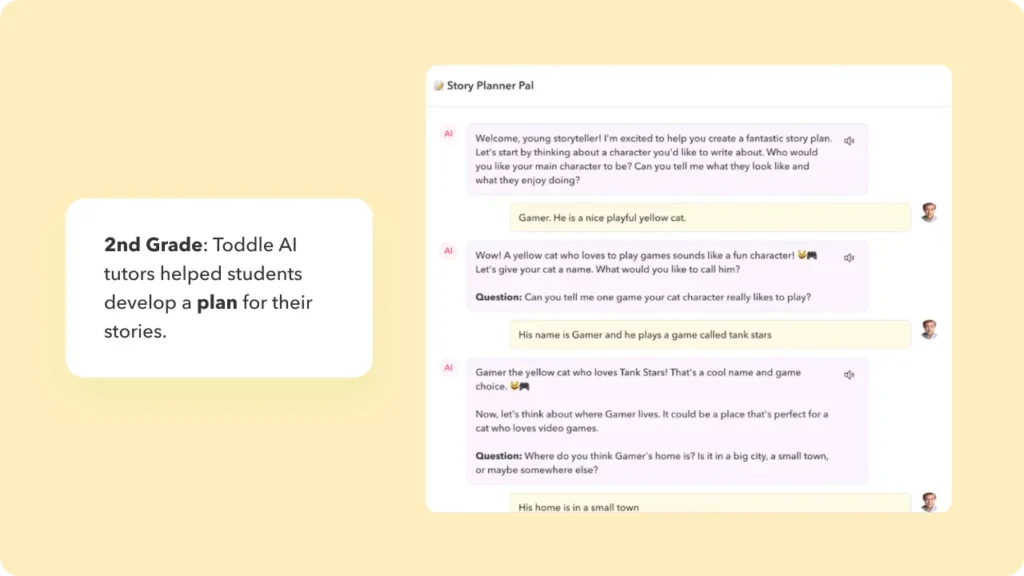 Toddle’s AI Tutors bring that sustained engagement into our classrooms. In Grade 2, the Story Planner Pal tutor guides students to build stories through conversation, asking about characters, motivations, and settings. Students stay mentally present, shaping their stories through reasoning rather than filling out templates.