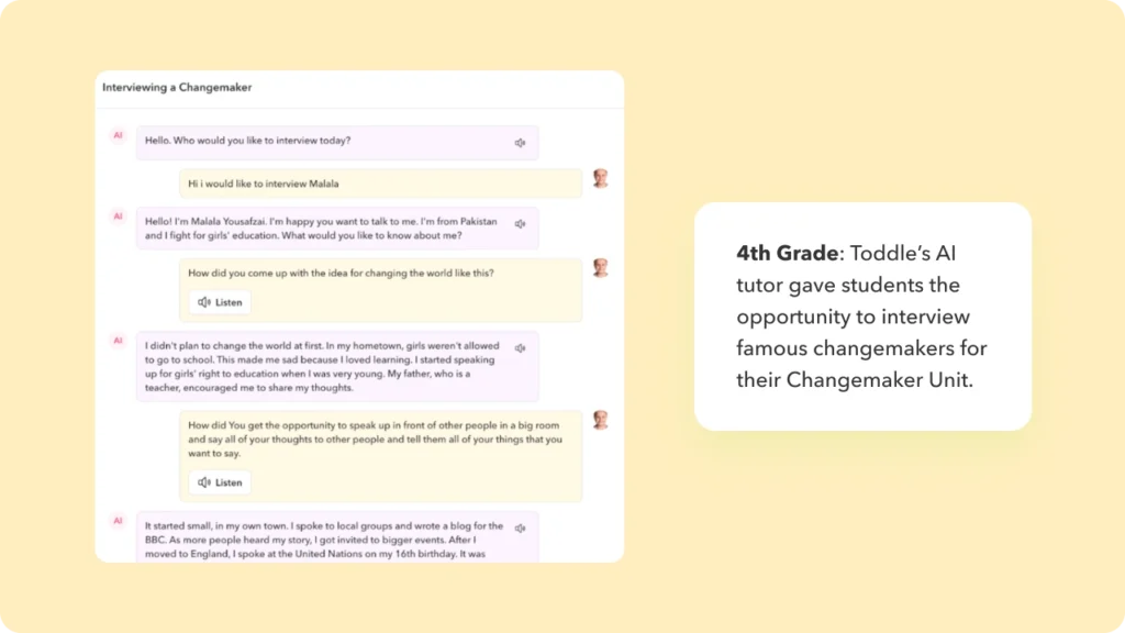 In Grade 4’s Changemakers unit, students interact with tutors modelled after leaders like Malala Yousafzai and Martin Luther King Jr. These conversations push them to think about justice, courage, and leadership – ideas that deepen understanding and keep curiosity alive.
