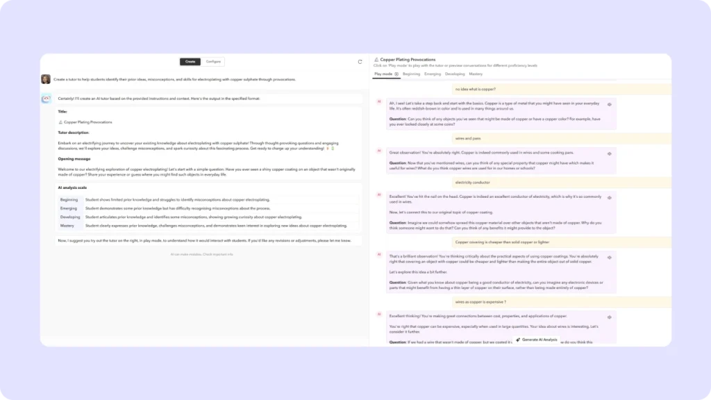 A big hurdle for schools with a staff as lean as ours is setting up meaningful cover when subject teachers are absent. Students often feel a bit lost trying to tackle new concepts on their own, and when teachers do return, they often find themselves reteaching everything, which really throws off the rhythm of learning. Fortunately for us, when our entire science team fell ill simultaneously at the start of the year, we had Toddle’s AI Tutors. I’m an arts teacher with little background in Grade 10 science. But I was able to set up an AI Tutor with comprehensive, interactive learning experiences on topics like copper plating that I couldn’t have taught effectively myself.