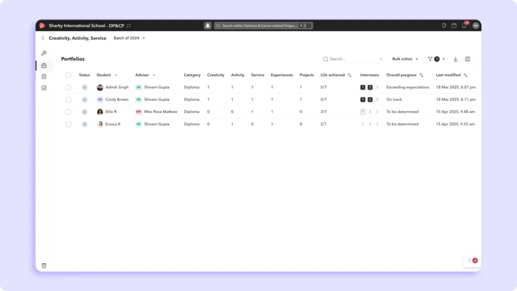 Now, with Toddle, everything is centralized and transparent. Students log their CAS experiences – whether it’s a video, a Google Doc, or a sketch – and reflect on their learning outcomes, all in one place. Coordinators can instantly track the number of experiences each student has completed, the learning outcomes they’ve achieved, the status of their portfolios, and even how many interviews they’ve attended.