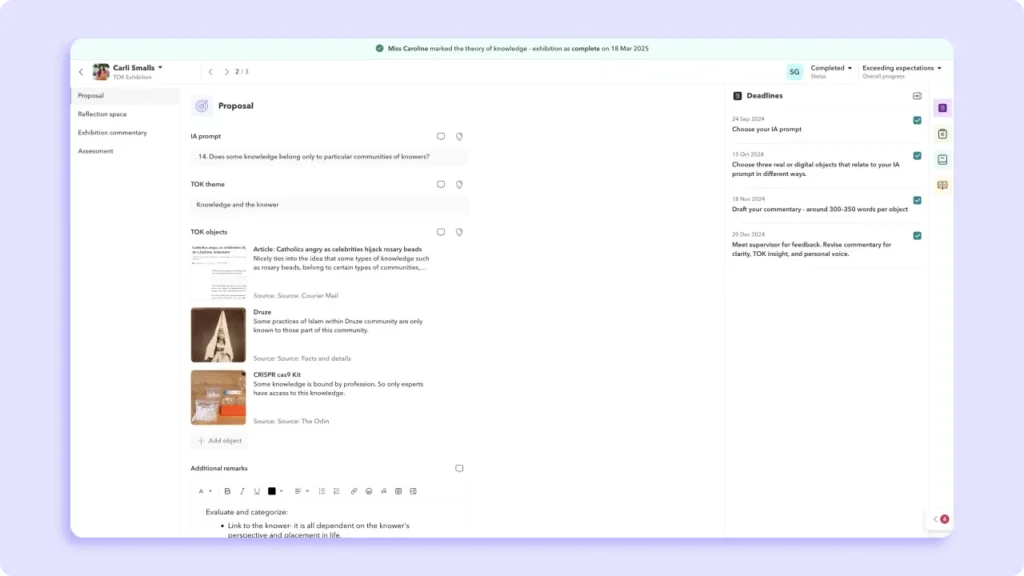 “Before Toddle, managing the TOK was a disconnected process. Students needed to find IB-provided essay titles on their own, teachers had to manually follow up on deadlines, and tracking progress across the essay and exhibition was time-consuming,” shares Rentoule.