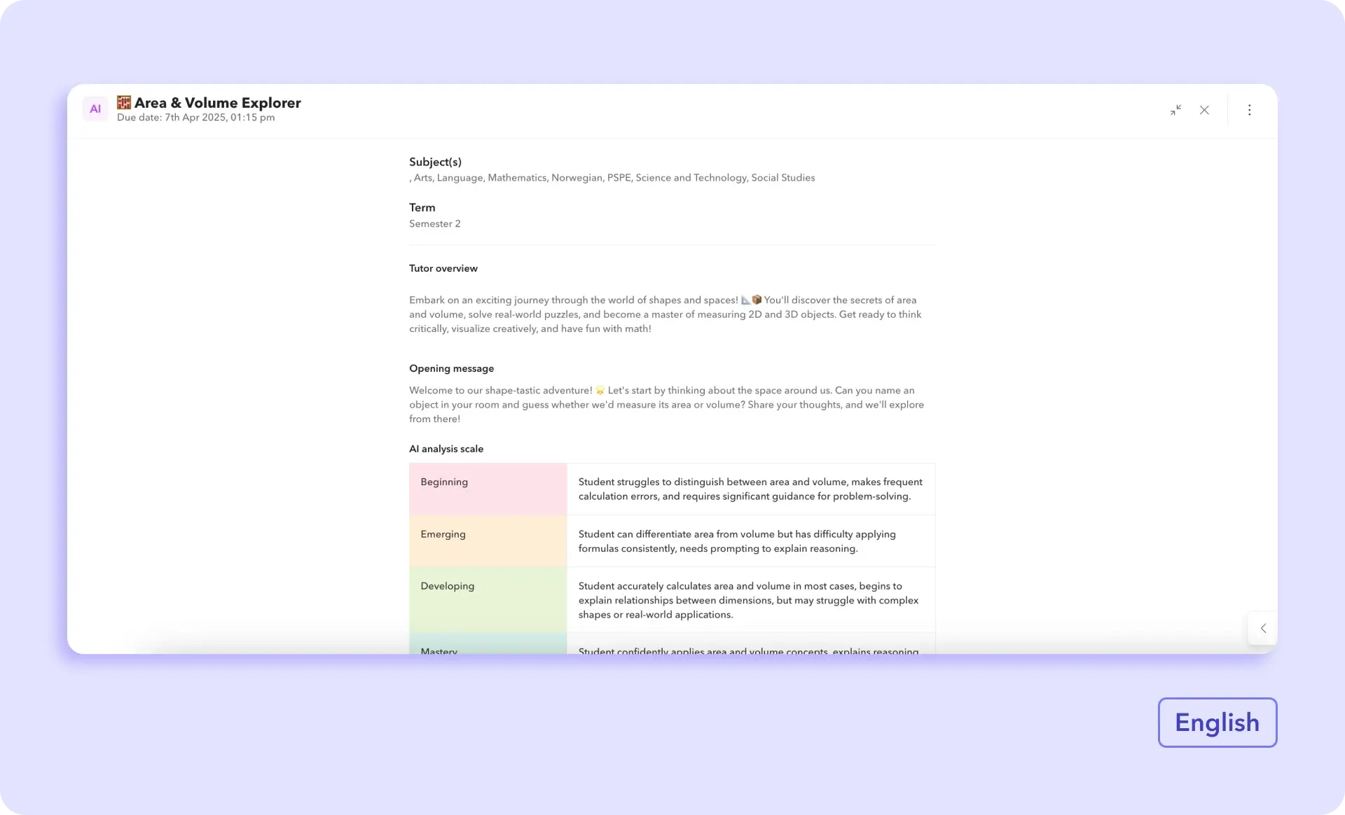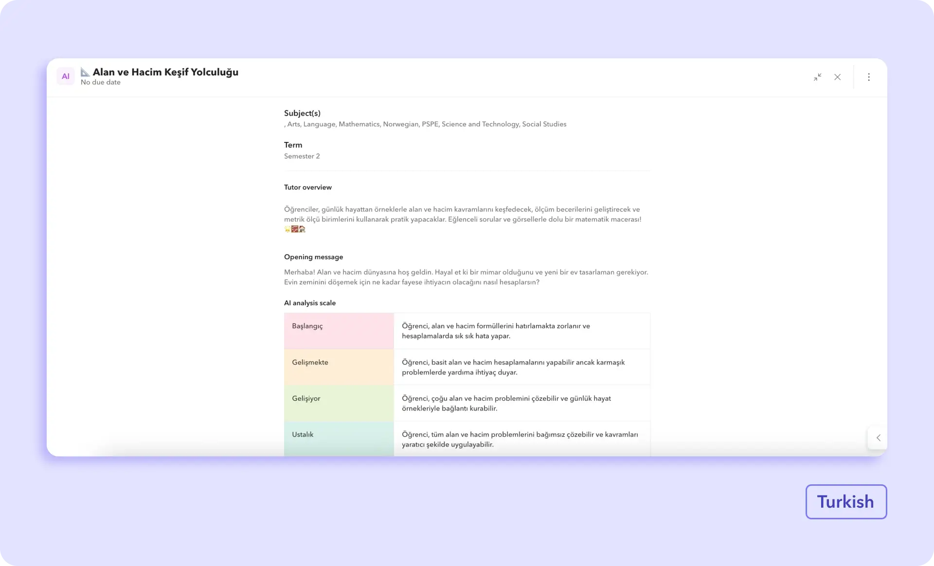 With Toddle’s AI Tutor, I was able to create a single learning experience and offer it in all three languages: English, Norwegian, and Turkish. Every student could access the task in the language they felt most confident using. And respond in that language, too.
