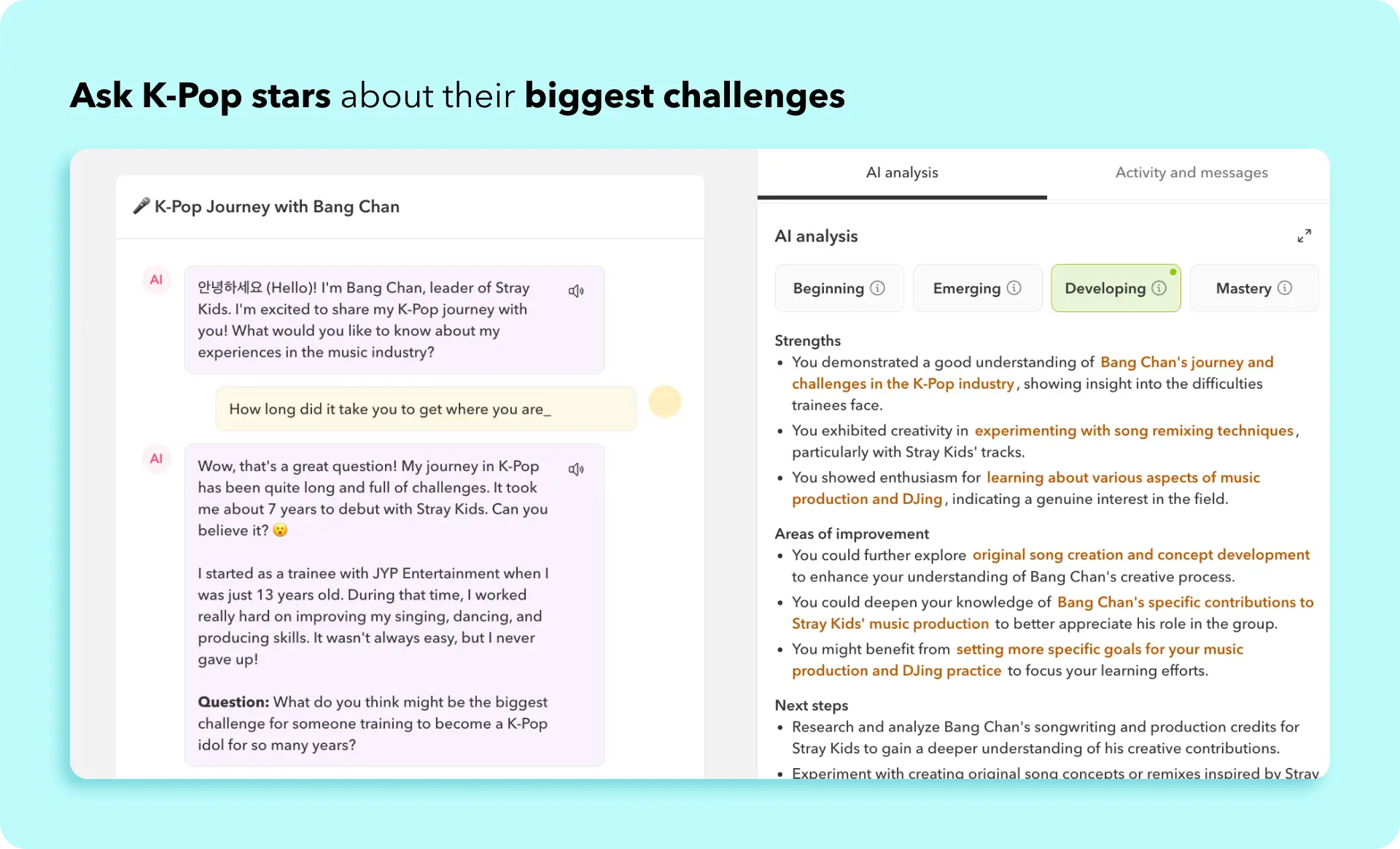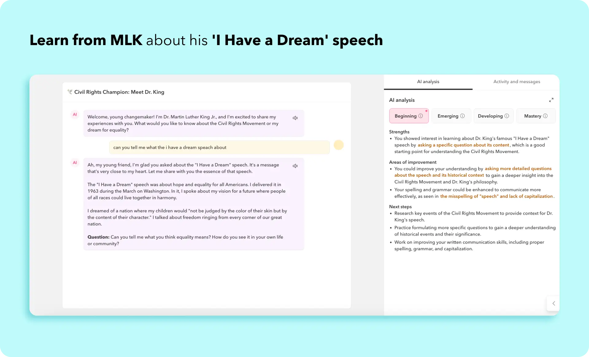 We created 13 AI Tutors, each one set up to role play as one of their heroes. Students could engage in a back-and-forth conversation with their chosen figure about any topic. They asked Rashford about his activism, talked to a K-pop idol about perseverance, and explored Lincoln’s motivations in his own era.