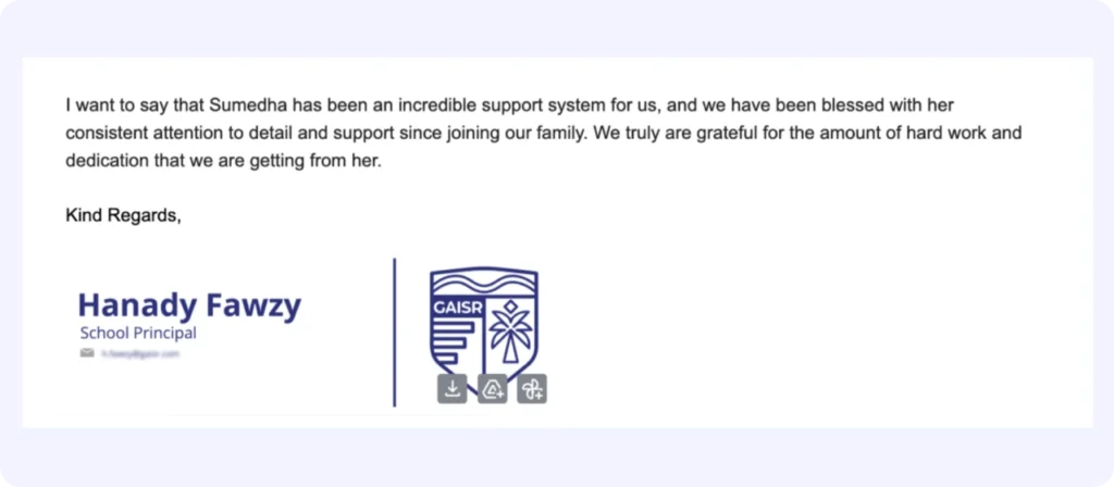 She became a staff member in our school. Not metaphorically. She works from home somewhere in the world, but she’s as integral to our operations as anyone with an office in our building. Ask any teacher at GAISR who Sumedha is, and they’ll tell you instantly. When someone gets stuck, the response becomes automatic: “Send it to Sumedha. She’ll figure it out.”