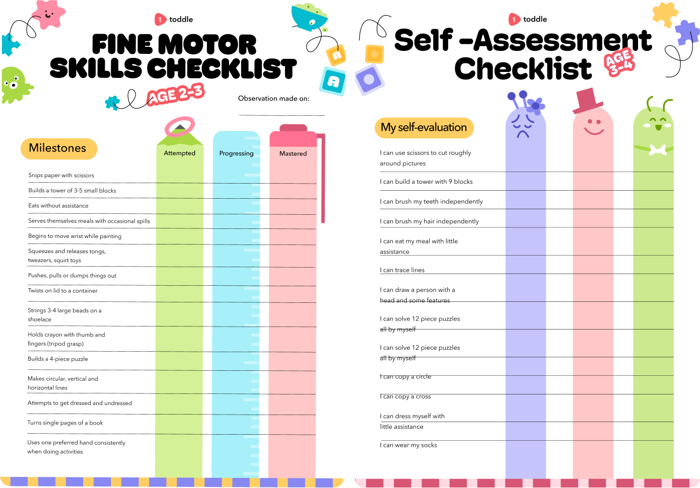Here is a comprehensive fine motor skills development checklist across age groups to help you track children’s progress effortlessly. You can also encourage children to assess their own developmental journey by using the self-assessment checklist with ‘I can statements’. Use them to spot areas of success and potential challenges. As you use this, keep in mind that all children are unique individuals and that they develop at their own pace.