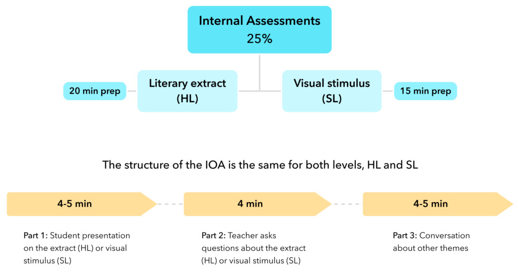 The internal assessments include an Individual Oral Activity (IOA) that makes up 25% of the total grade for both SL and HL students. These assessments are designed for students to showcase their analytical and critical thinking skills. In the HL course, the IOA is based on a literary extract. In the SL course, the IOA is based on a visual stimulus. Here is an overview of how the IOA is structured for both HL and SL courses: