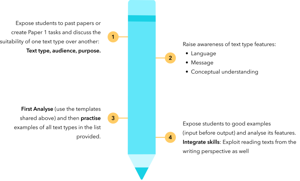 The first step for students towards producing a written response is choosing a situation. You will find a list of text types, along with samples, that students would need to be familiarised with here. Consider these strategies to help your students develop writing skills to master the different text types: