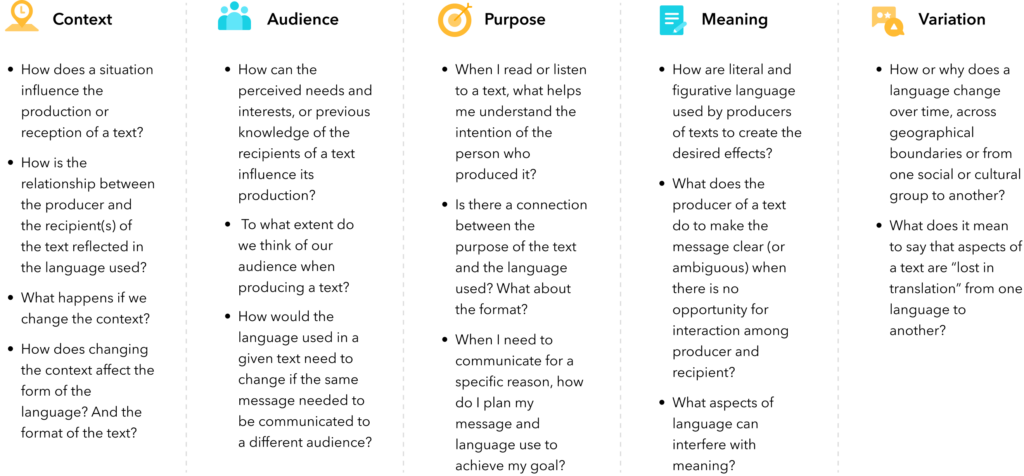 Students’ abilities to read, write, and speak will gain nuance when you teach them how audience, purpose, meaning, variation, place, and time relate to what is being communicated. You can guide students toward showing their conceptual understanding of a text through their written responses. When writing, ask them to think about the audience, for example. How would an author write for a different audience? How would they change what they are writing if it were for their teacher instead of a friend? When you ask students questions like these you help them develop skills to produce effective texts themselves. You also help them reflect on these different concepts. Take a look at some of the sample questions in the table below to get your students thinking about the conceptual understanding of a situation. You may also like to use these samples to make your own!