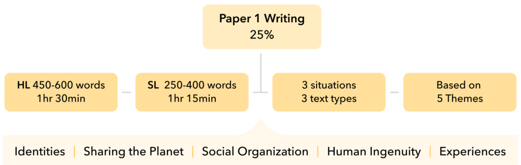 Paper 1 is a written examination based on the five language B themes. Students are provided with three situations along with choices for text types they can create in response to any one of those situations.