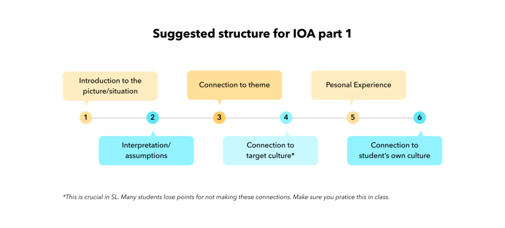 For the IOA, SL students analyze a visual stimulus while making links to the language B themes. Developing a thorough understanding of how students need to approach the IOA can go a long way in supporting student success. Let’s begin by taking a look at the IOA structure.