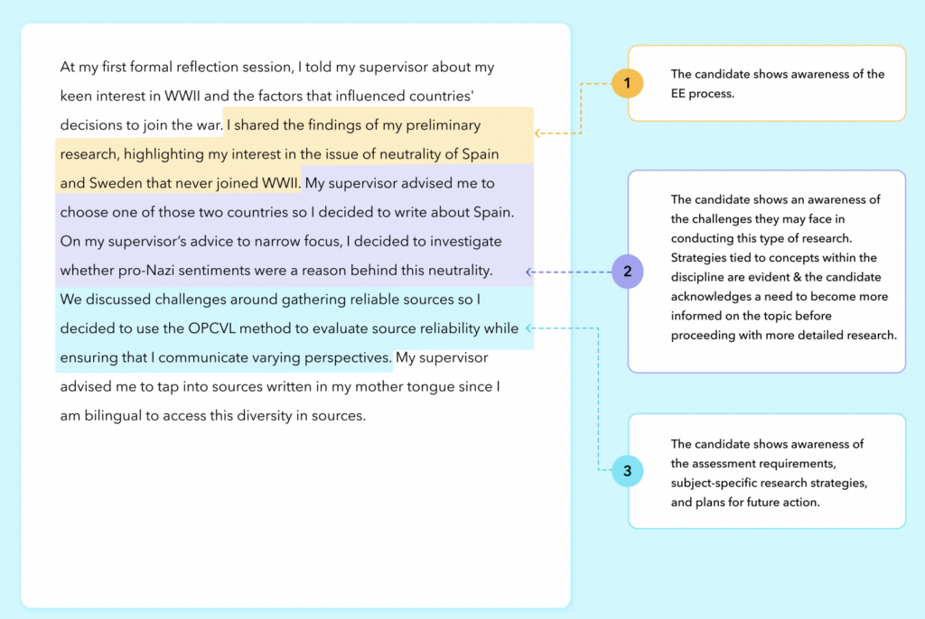 During the course of writing their EEs, students are required to record three reflections. While many of your students may be familiar with research and writing, formal reflection could be something entirely new to them. As students work through their EEs, documenting what they’ve done in their Researcher’s Reflection Space (RRS) will help jog their memory later. The RRS could be a paper notebook, a Google doc, or any other format students are comfortable with recording their thoughts and process.