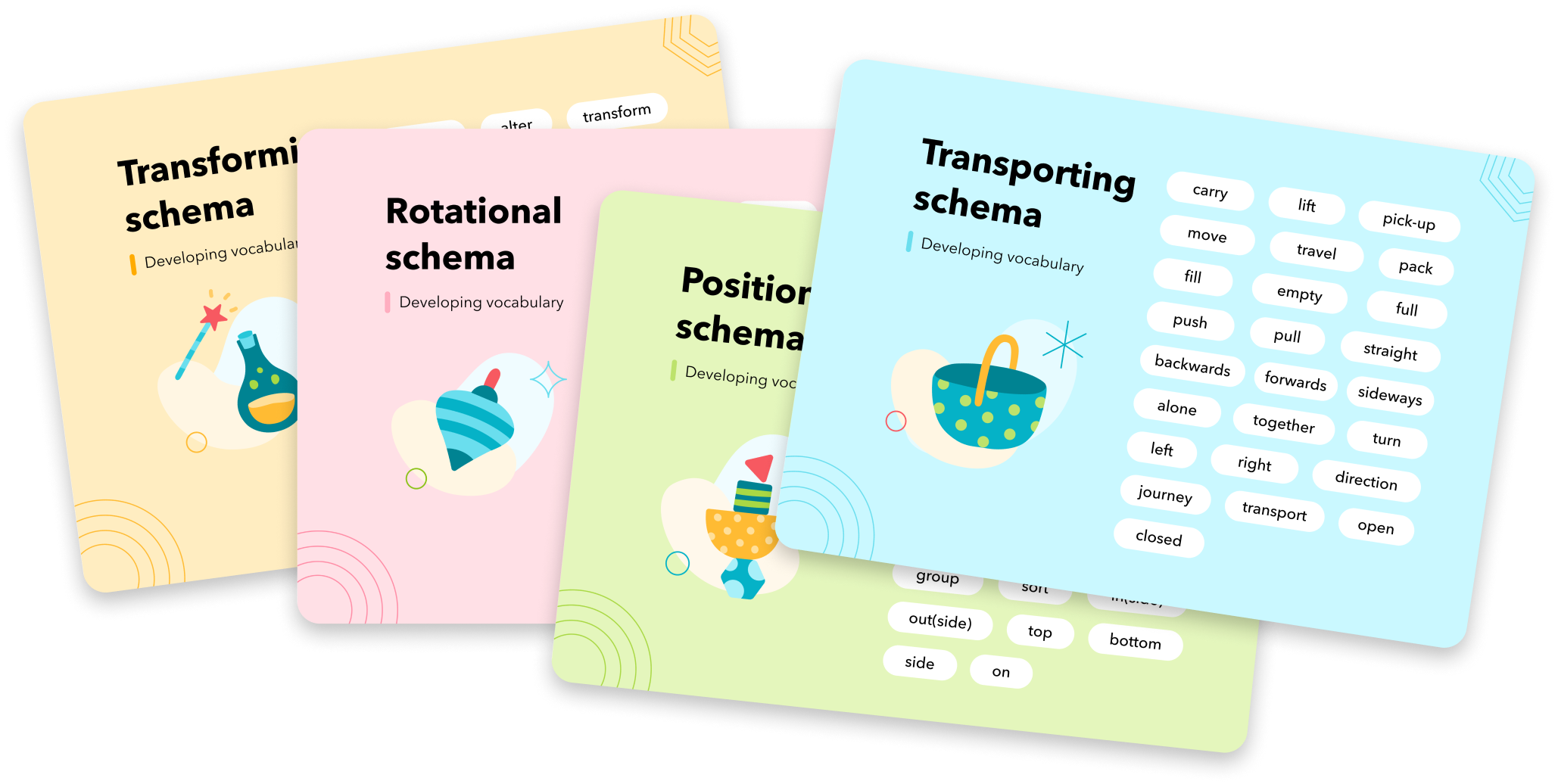 We have created a downloadable set of vocabulary cards specifically related to schematic play, that you can use to facilitate your interactions with children, and their development of language. These are ‘peek and use’ synonyms and antonyms that can enhance dialogue in play.