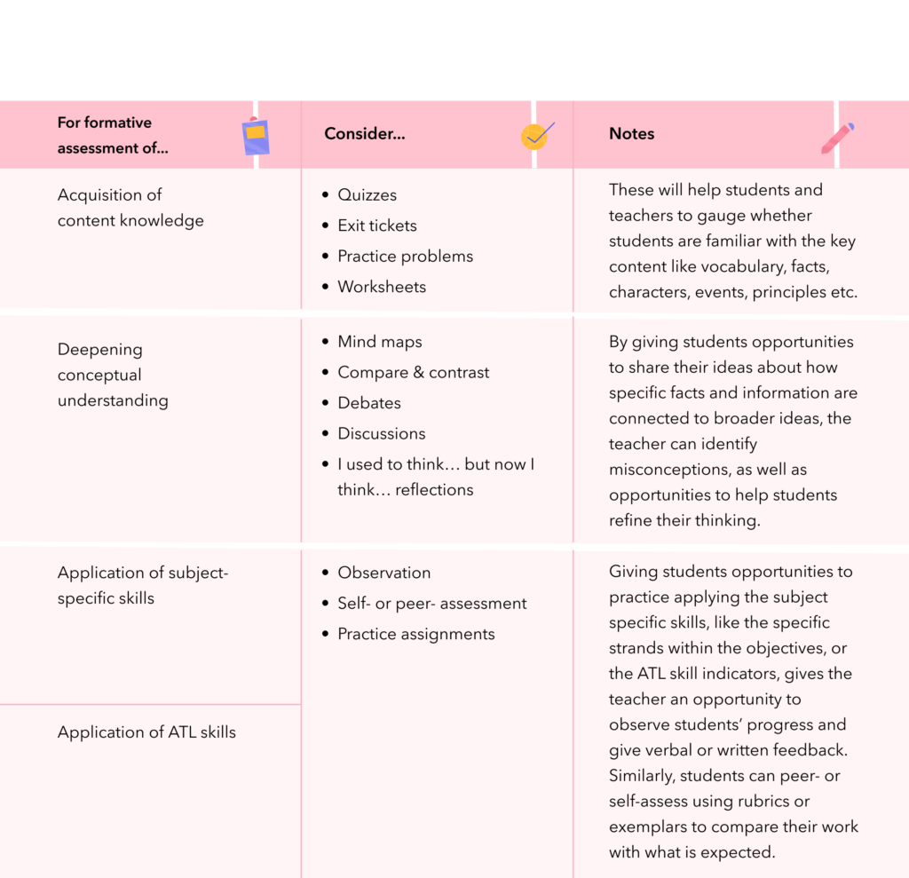 MYP units are designed to help students develop content knowledge, conceptual understanding, the subject-specific skills described in the objectives and approaches to learning skills. That’s why formative assessment tasks should be designed to give students and teachers insight into how students are progressing towards each of those goals. The formative assessment strategy you select (how you assess) depends on the progress you are monitoring (what you are assessing). Here are some examples:
