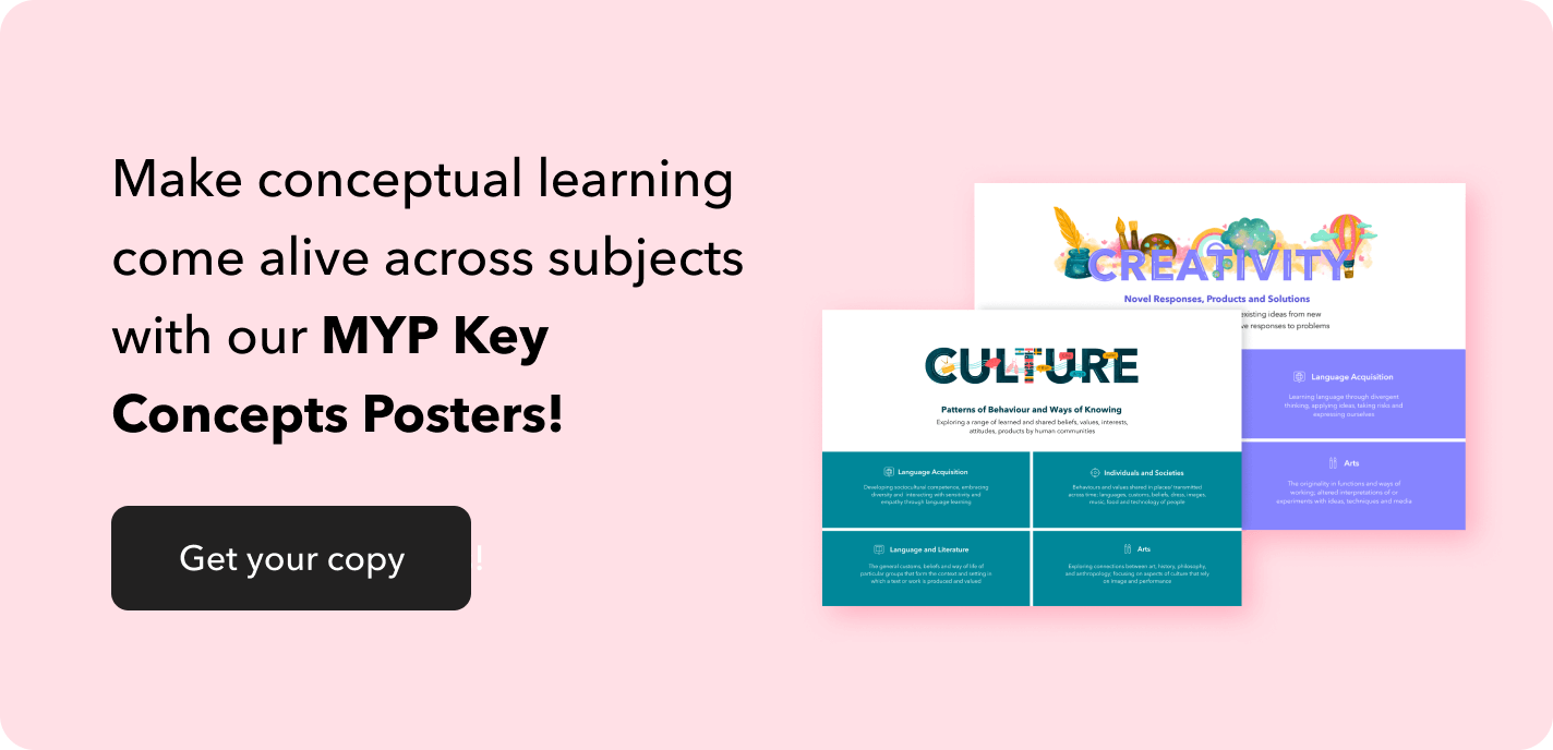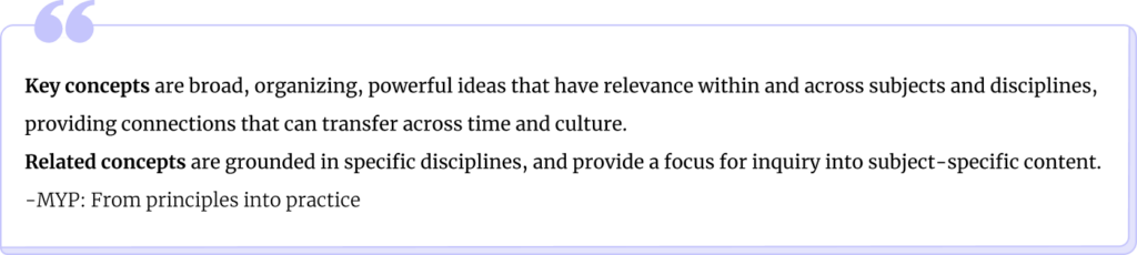 The MYP is a conceptually driven framework, encouraging students to connect concepts or ‘big ideas’ across subject groups with the world outside. All units use one key concept and a variety of related